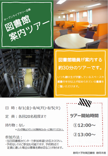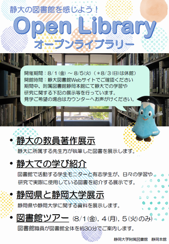 夏季オープンキャンパスの期間に合わせて、静岡大学附属図書館 静岡本館ではオープンライブラリーを開催いたします。